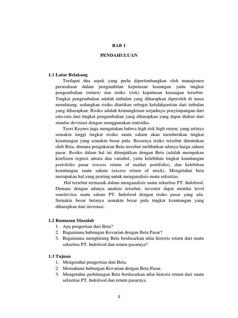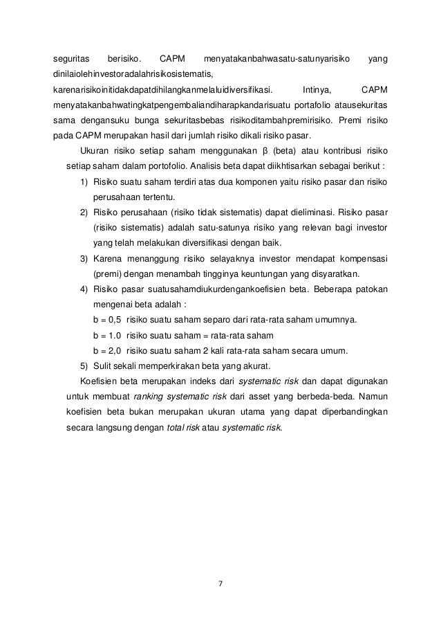 Berikut adalah panduan cara mencari beta saham melalui situs reuters: Karena pasar digunakan sebagai acuan, maka beta pasar, dalam hal ini diwakili oleh ihsg, ditetapkan dengan angka satu. Saham adalah tanda penyertaan modal pada suatu perusahaan perseroan terbatas dengan manfaat yang dapat diperoleh berupa deviden yaitu bagian dari keuntungan perusahaan yang dibagikan kepada pemilik saham, capital gain adalah keuntungan yang diiperoleh dari selisih jual dengan harga belinya, manfaat non financial antara lain berupa konsekuensinya atas kepemilikan saham berupa kekuasaan.
